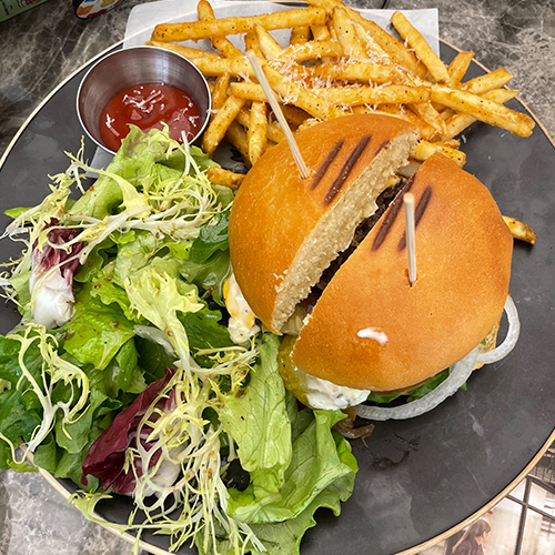 다음으로 까르보나라가 나왔다. 푸짐하고 너무 묽지 않은 그렇다고 꾸덕하지 않은 적당한 소스와 부드럽고 탱탱한 파스타 면이 올라가 있다. 까르보나라는 어디에서 먹든 평타는 치기 때문에 걱정하지 않았다. 아기 한 입을 시작으로 맛을 봤다. 크리미한 소스 맛과 탱탱한 면의 느낌이 좋다. 그리고 느끼함 잡아주는 마늘이 과하지 않고 적당한 균형을 이루고 있다. 느끼함 없이 한 그릇 다 비울 수 있을 거 같다. 까르보나라와 절묘한 마늘 맛을 즐기는 사이 수제버거가 나왔다.